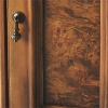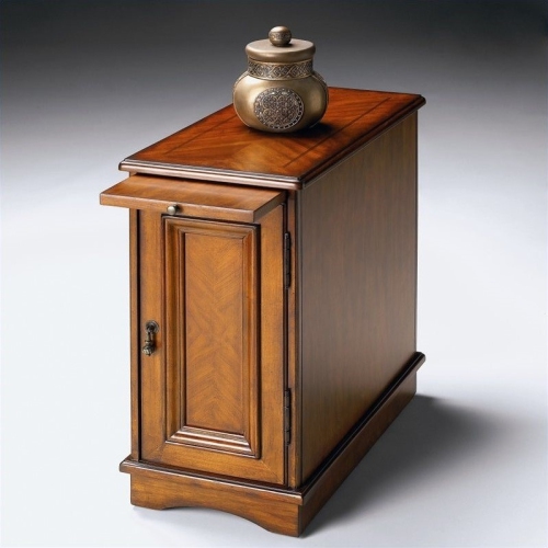 Perfect for any living area or den, this chair side chest is an elegant and practical piece. Crafted of selected solid woods and choice veneers, this side chest features a useful pull-out tray to hold drinks, TV remotes or other items. The paneled door with antique brass finished hardware opens to reveal an ample storage space. The warm olive ash burl finish completes the look. Selected solid woods with choice cherry veneers. Four-way book matched cherry veneer top wit...