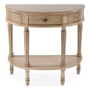 Exuding casual elegance, this beautiful demilune console is perfect for small spaces. Meticulously crafted from poplar wood and wood products, it has a gorgeous hand painted finish over choice veneers.Features : Beige hand painted finishCrafted from Poplar wood, engineered wood, and Cherry veneersHand-carved legsFeatures a drawer for storage and a lower shelf for displayAntique brass-finished hardware<li...