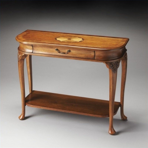This classic console table features a meticulously handcrafted linen-fold inlay in cherry, maple and walnut veneers on top, stylized cabriole legs in a respendent olive ash burl finish. Drawer with antique brass-finished hardware provides convenient storage.Features : Finish: Olive Ash BurlMaterial: Select Wood Solids, MDF, Resin, Cherry, Maple and Walnut VeneersShape: RectangularStyle: TraditionalDistressed ...