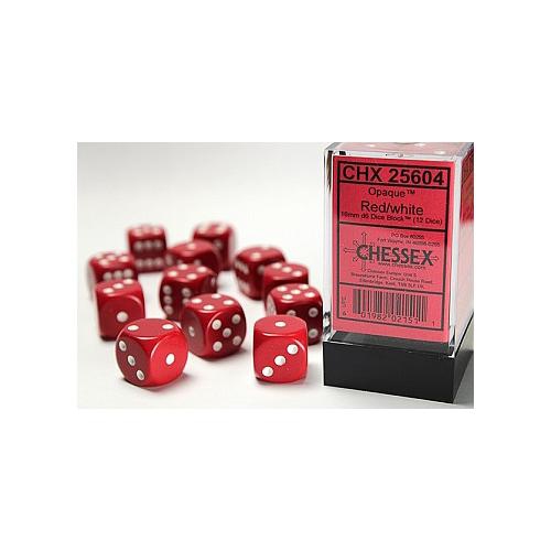 Twelve plastic 16mm Red Opaque 6-sided dice. Chessex Opaque dice have a striking rich colour. These dice are Red and have White pips.