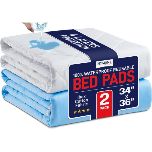 HYGIENX Reusable Bed Pads, 34"x36" 2 Pack, 4 Layers Waterproof Underpad Soft Absorbent Cotton Breathable Incontinence Pad Washable Quick Dry Mattress Cover Quilted Nursing Protector, Bed Sofa Kid Dog