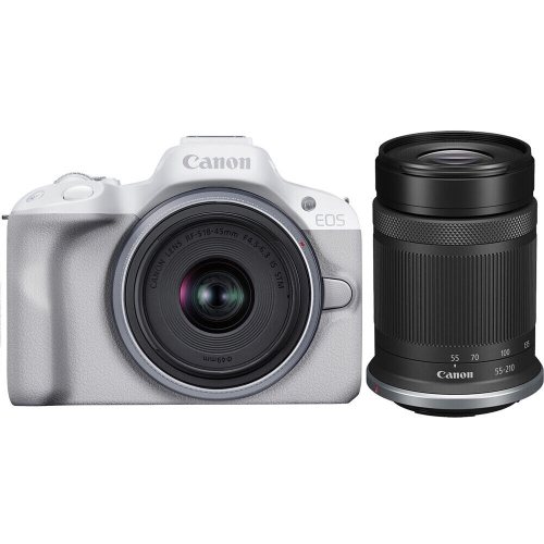 Bundling a sophisticated camera body with two versatile lenses, the Canon EOS R50 Mirrorless Camera with 18-45mm and 55-210mm Lenses pairs the white multimedia mirrorless camera with the RF-S 18-45mm f/4.5-6.3 IS STM standard zoom lens and the RF-S 55-210mm f/5-7.1 IS STM telephoto zoom lens.