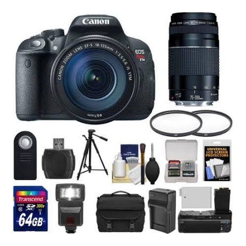 This Canon EOS Rebel T5i DSLR Camera Kit from B&H Photo bundles the Rebel T5i DSLR with the EF-S 18-135mm f/3.5-5.6 and EF 75-300mm f/4.0-5.6 IIIlenses. Start enjoying your camera while taking advantage of a wide-to-telephoto zoom lens, which covers 35mm-equivalent focal lengths of 29-216mm, and afull-frame 75-300mm telephoto that greatly expands your range of perspectives.The Canon EOS Rebel T5i is an APS-C format digital SLR, featuring an 18MP CMOS sensor and DIGIC 5 image processor for high-resolution still images, Full HD1080/30/24p video with Continuous AF, and an ISO range of 100-12800, which is expandable to 25600. The 9-point cross-type AF system provides fast focusingwhen shooting with the viewfinder, and Hybrid CMOS AF increases autofocus speeds when shooting in Live View. The Rebel T5i can continuously shoot up to 5fps. Additionally, a 3.0 Clear View II vari-angle Touchscreen LCD with 1,040k-dot resolution enables composition and playback. Tilt and swivel capabilitymakes it easy to compose shots at odd angles, and a smudge-resistant coating keeps the monitor clear.The 18-135mm f/3.5-5.6 lens offers a full-frame equivalent range of 29-216mm. Canons Optical and Dynamic Image Stabilization systems reduce the effects ofcamera shake for blur-free still images and videos, respectively. The autofocus stepping motor (STM) offers fast, accurate and quiet autofocus when usingthe Movie Servo mode on the Rebel T5i to record video. Aspherical and Ultra-low Dispersion elements minimize aberrations for sharp, high-contrast imaging.The 75-300mm f/4.0-5.6 III lens is designed for full-frame cameras but is also APS-C compatible. It utilizes a DC motor to drive autofocus. The lenscontains 13 elements in 9 groups, and features seven diaphragm blades that produce pleasing blur in the out-of-focus areas of images. It offers 0.25xmagnification and is capable of focusing as close as 4.92.This Kit Includes:Canon EOS Rebel T5i DSLR Camera with EF-S 18-135mm f/3.5-5.6 IS STM Lens