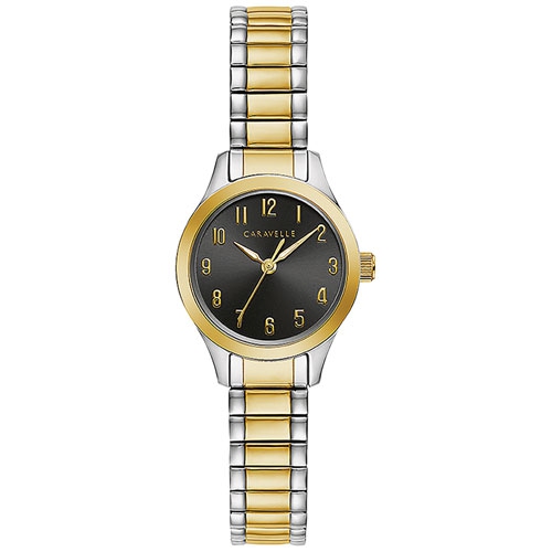 With its two-tone finish and dramatic black dial, this Caravelle dress women's fashion watch will take you effortlessly from day to night. It features a minimalist design and an easy-to-read face for simple sophistication. It's equipped with an expansion bracelet so it's easy to slip on and off while providing a comfortable fit.