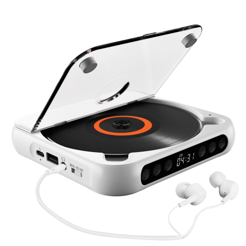 CD player portable bluetooth music player with dust cover, earphones, suitable for home and trave-White