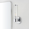 Add vintage glamour to your master bath with our classic mid-century style chrome wall light. A single Edison-style LED bulb in a clear glass cylinder provides plenty of light. Make a statement with two of these large sconce lights flanking a mirror, or use them to light a hallway. Clean lines and a sparkling chrome finish add modern Art Deco style to your bath vanity, hallway or entry.
