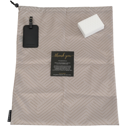 Champs branded faux leather luggage tag, a 17.5" X 21.5" laundry bag and a handy scuff remover to buff nicks and scratches out of your luggage and keep it looking brand new. This package is thoughtfully designed with our travel-loving friends in mind, to welcome you to the Champs family.