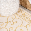 With a filigree design reminiscent of antique iron gates, our Boho-chic rug adds eclectic style to an outdoor porch or patio. Tones of cream mingled with a soft green pattern give this rug a hand-woven, vintage vibe.
