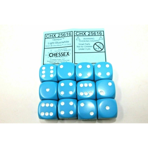 Twelve plastic 16mm Light Blue Opaque 6-sided dice. Chessex Opaque dice have a striking rich colour. These dice are Light Blue and have White pips.