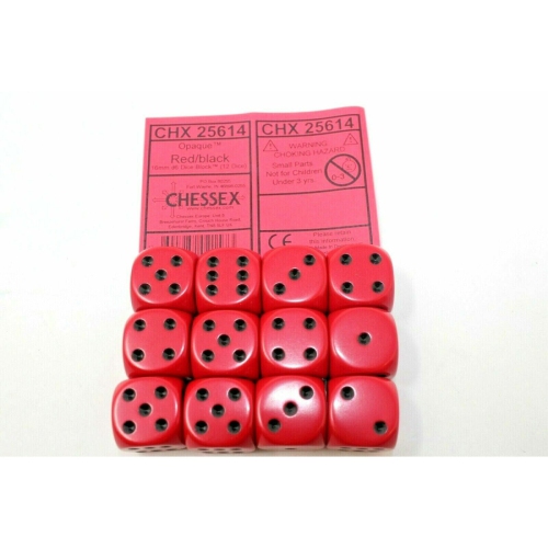 Twelve plastic 16mm Red Opaque 6-sided dice. Chessex Opaque dice have a striking rich colour. These dice are Red and have Black pips.