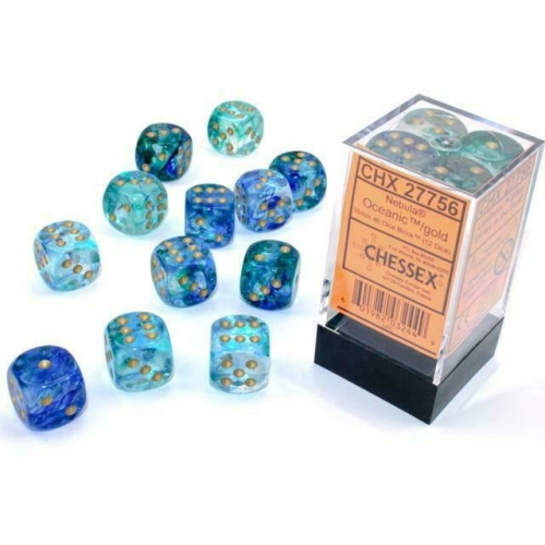 Chessex Nebula: 12D6 Oceanic/Gold Luminary NewA set of glow-in-the-dark nebula oceanic dice with gold numbers.Contents:⢠12 Six-sided Dicespan data-mce-fragment="1...