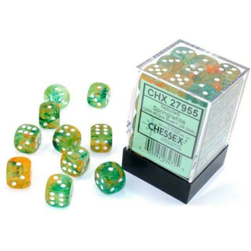 Chessex Nebula: 36D6 Spring/White Luminary NewA set of glow-in-the-dark nebula spring dice with white numbers.Contents:⢠36 Six-sided Dice (12mm)Due to the unique d...