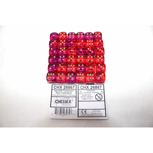 Chessex Translucent Red Violet with Gold 36 Gemini 12mm Dice - CHX26867Each Set contains 36 Gemini Translucent Red-Violet 12mm d6 dice with gold pips in a CHX02804 Display Case w/Lid