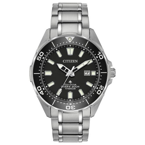 CITIZEN®'s PROMASTER Diver is the perfect ISO compliant timepiece for the bold seeking the thrill of a deep-sea challenge. Built with diving in mind, this timepiece is tough and durable. Shown here in a Super Titanium™ case and bracelet, this timepiece features a one-way rotating elapsed-time bezel, a screw-back case and screw-down crown, and an anti-reflective crystal. Water resistant up to 200m.