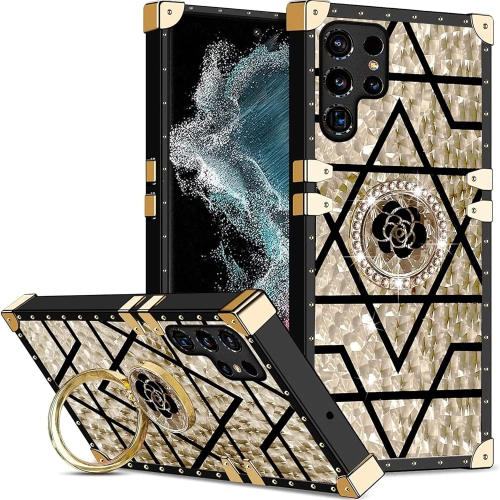 Classic Square Phone Case for Samsung Galaxy S23 Ultra (Not S23) with Ring Kickstand, Elegant Metal Decoration