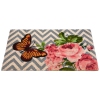 Pink and gray spring printed outdoor mat. Accented with a decorative spring rose and butterfly design. Recommended for both indoor or outdoor use