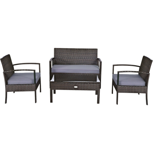 Transform your outdoor space into a stylish and comfortable retreat with this 4-piece patio rattan furniture set. This set includes a spacious loveseat, two cozy armchairs, and a matching coffee table, all designed to create an inviting atmosphere for relaxation and conversation. The high-quality rattan frame offers both durability and a sleek, modern look, while the thick, plush cushions ensure maximum comfort.