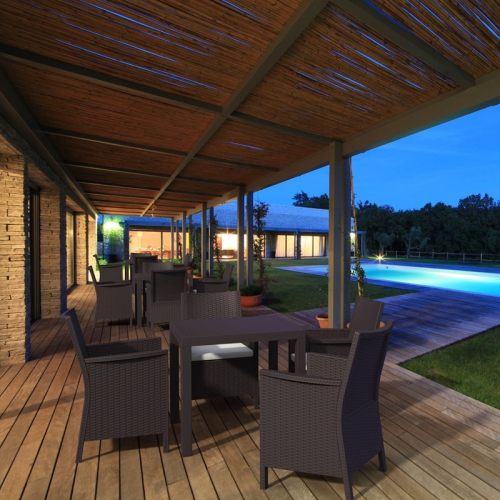 California Wickerlook resin patio dining set with four patio dining arm chairs and one 31 inch square dining table. Unlike any other woven furniture in the market Wickerlook furniture will never unravel. chairs have no metal parts to rust, no moving parts