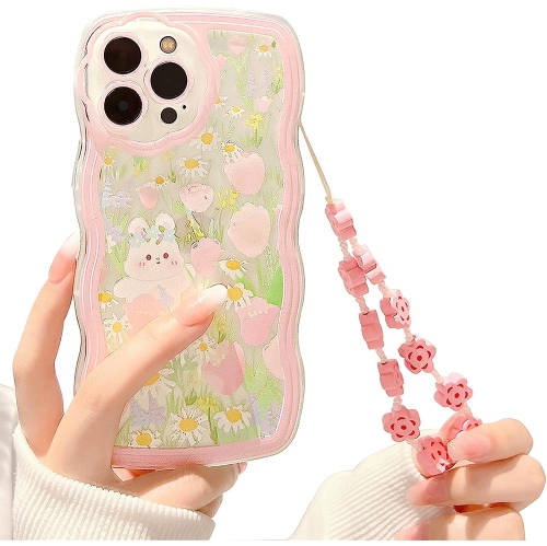 Compatible for iPhone 14 Pro Case, Cute Clear Cartoon Floral Rabbit with Heart Beaded Lanyard Wrist Strap
