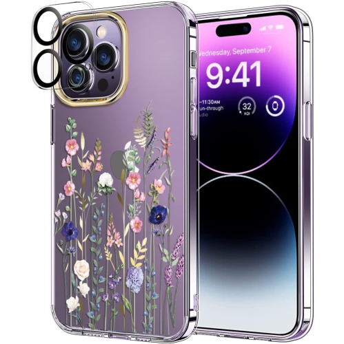 Compatible with iPhone 14 Pro Case with Flowers,for Girly Women,Shockproof Clear Floral Pattern Hard Back Cover