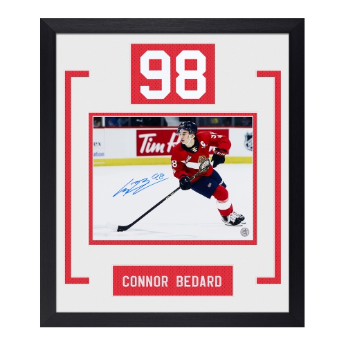 The 11x14 photo in this frame is hand-signed by Connor Bedard.
