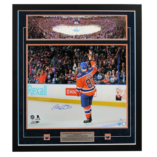 Connor McDavid Edmonton Oilers Autographed Final Game At Rexall 31x35 Frame #/97. This 20x24 photo has been hand signed by Connor McDavid waving to the crowd after the Final Game at Rexall place in Edmonton. Then the photo is professionally mounted and framed with dual pins and name plate. The frame measures 31"x35"and is ready to hang and display on any wall. To protect your purchase, thi...