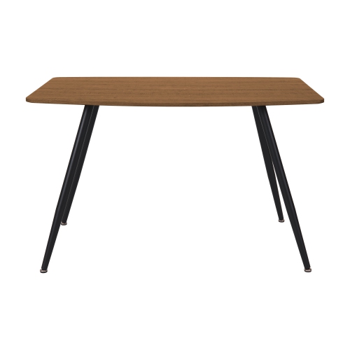 This elegant dining table features flared black iron legs and an attractive brown wood-stained finish offering a hint of industrial mid-century modern design to your dining or kitchen space. With room for up to 4 people, this faux-wood table's clean lines and trendy design pair nicely with a variety of chairs and home decor styles.