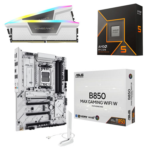 Boost your PC's performance with Corsair Vengeance RGB 64GB desktop memory, AMD Ryzen 5 9600X AM5 processor, and ASUS B850 Max Gaming WIFI W motherboard bundle.