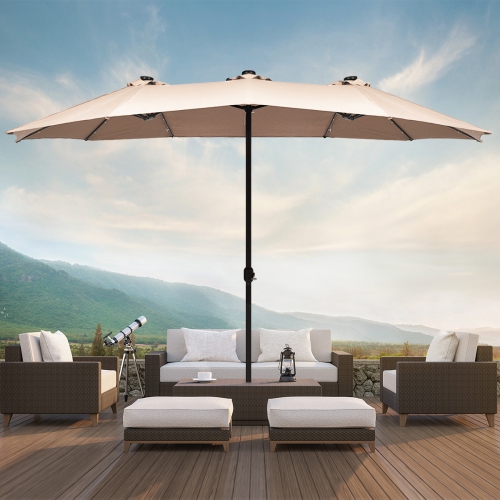 The 15ft solar patio double-sided umbrella provides an ample shade to keep you cool and protect from the hot sun. Made of strong thick steel pole and 12 sturdy ribs, the solar LED patio twin umbrella is stable and resistant for outdoor use. Plus, premium fabric canopy is fade-resistant and water-proof while offer well sun protection.