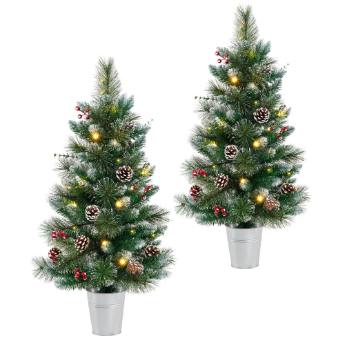 Emitting a snowy charm, the all-in-one decoration features 81 branch tips that are made of new PVC. In addition, the 3 ft Xmas tree comes with lush pine needles, eucalyptus leaves, natural pine cones, and red berries that add a realistic touch. Plus, 20 warm white LED lights offer 8 lighting modes, including combination, in wave, slo glo, sequential, chasing/flash, slow fade, twinkle/flash, and steady on. Moreover, the tree features a timer for 6 hours and off for 18 hours.