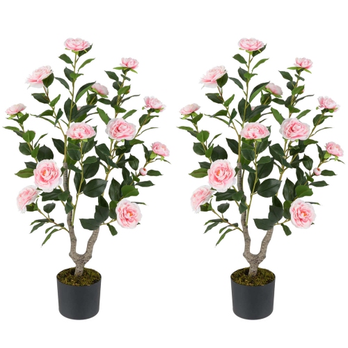 Costway 2 PCS 36" Artificial Camellia Tree Fake Potted Tree Greenery Floral Plant Modern Pink