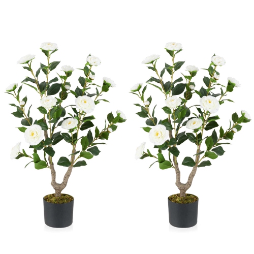 Costway 2 PCS 36" Artificial Camellia Tree Fake Potted Tree Greenery Floral Plant Modern White