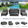 Our product features 1 loveseat, 2 armless sofas, 2 ottomans and 1 coffee table, allowing you to combine all the pieces freely . Patio set is exactly perfect for outdoor use, as the rattan is all-weather resistant and the steel frame is anti-rust and sturdy enough. Cover of cushions is proof against splashing water so you don't have to worry about the spilling liquids.