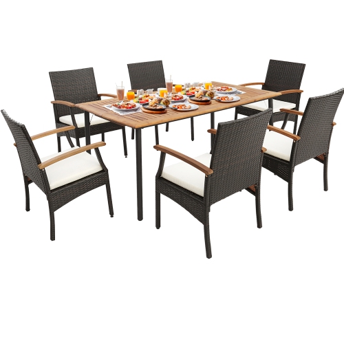 Costway 7PCS Patio Wicker Dining Set Cushion Acacia Wood Armrests Table with Umbrella Hole