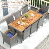 Crafted from fade-resistant mix gray PE rattan and long-lasting acacia wood, the dining set combines beauty and resilience. Ergonomic chairs feature inclined backrests, curved armrests, and soft cushions with removable covers for easy cleaning. The spacious rectangular table includes a 2" umbrella hole, fitting most patio umbrellas to keep you shaded during sunny days. For added convenience, 6 chairs can be neatly tucked under the table, saving space when not in use.