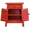 Angular in form, our Zen cabinet will add a touch of whimsy to your living room, hallway or den and brighten any living space. Carved metal drop key design enhances this solid mahogany wood Asian end table handcrafted and finished in regal red distressed paint with lacquer finish. Ideal night table size to place next to your existing wood or upholstered bed and add a pop of color to your bedroom. Add spice to your boring entryway, two doors to keep clutter out of sight...