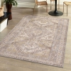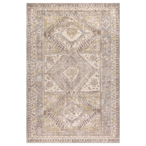 Three diamond-shaped medallions in the center of this design recall Moroccan tribal rugs. The neutral gray color scheme adds a modern twist. With its Bohemian-inspired, distressed look, this rug would be Perfect for a living room.