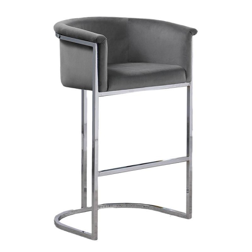 Single counterheight chair upholstered with Dark Gray velvet and a Silver metal chrome base. This chair has a leg height of 24" and a total height of 34". Other available colors are: Dark Gray, Navy Blue, Black, Cream, and Pink, and base color options are Silver or Gold chrome. Minimal assembly required.Features : Dark GrayCounterheight (24")Velvet FabricSilver Chrome BaseSingle chairOther colors ...
