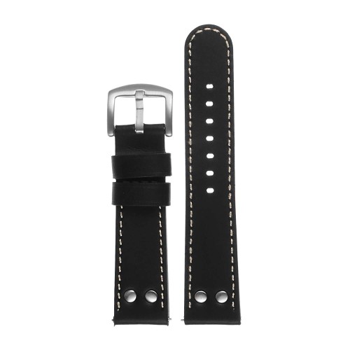 Premium pilot style watch band by DASSARI. Made from top grain leather sourced from Italy. Features silver rivets and buckle. Comes with condensed leather backing for extra comfort and durability. Finished with ivory contour stitching and easy quick release spring bars. Fits TW Steel watches as well as most others with standard lug attachments.