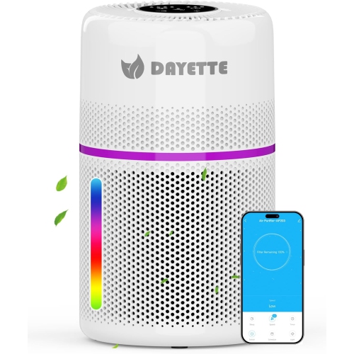 The DAYETTE WiFi HEPA 13 Air Purifier offers 1800 sq.ft coverage with a 3-stage filtration system. Featuring smart control through an app, touch, or voice, it removes dust, allergens, pet hair, and odors. Enjoy quiet operation (20dB), colorful ambient lighting, and customizable timers for a healthier home environment.