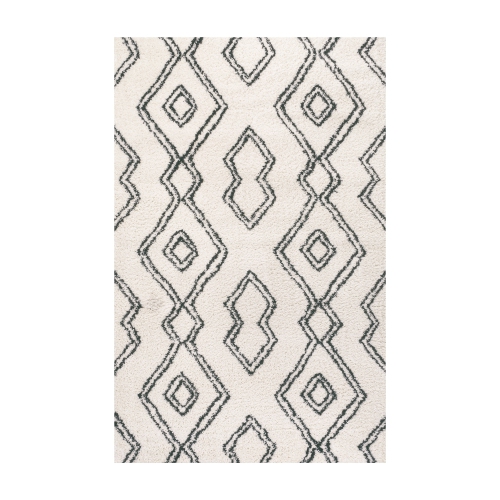 Inspired by vintage Beni Ourain Moroccan rugs, our soft and fluffy shag yarns make it easy to go barefoot. The classic Moroccan pattern has a geometric design of deep gray diamonds on a field of ivory.