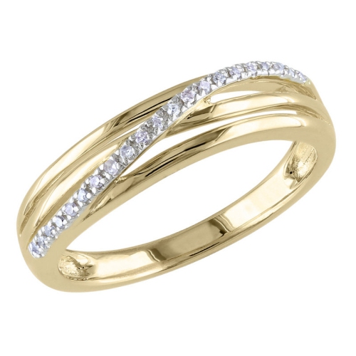 A classic band featuring sparkling accent diamonds along the top all crafted in yellow plated sterling silver. This simple and elegant crossover ring has 0.06 carats (ctw) of accent diamonds.