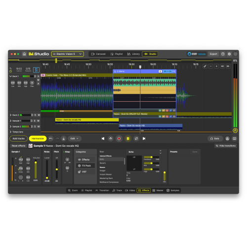 Unlock your full potential with DJ.Studio Ultimate-Edition’, made for the more advanced DJs. This comprehensive suite of tools enables DJs to prepare and create mixes and mashups with masterful expression and an expanded set of features like automations, mastering, Stem separation and VST effects.