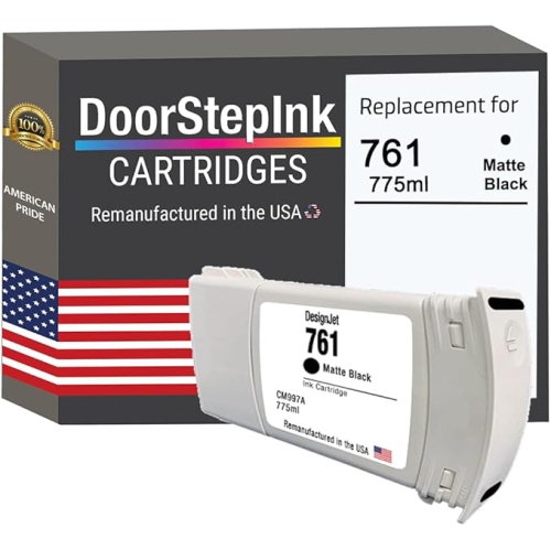 DoorStepInk remanufactured HP 761 775mL matte black ink cartridges are the highest quality wide format replacement ink cartridges on the market. Using only original HP CM997A matte black cartridges, we remanufacture each cartridge to the highest quality standards to match OEM ink level, color, and performance guaranteed!