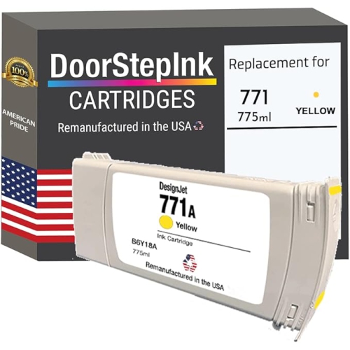 DoorStepInk remanufactured HP 771 775mL yellow ink cartridges are the highest quality wide format replacement ink cartridges on the market. Using only original HP B6Y18A yellow cartridges, we remanufacture each cartridge to the highest quality standards to match OEM ink level, color, and performance guaranteed!