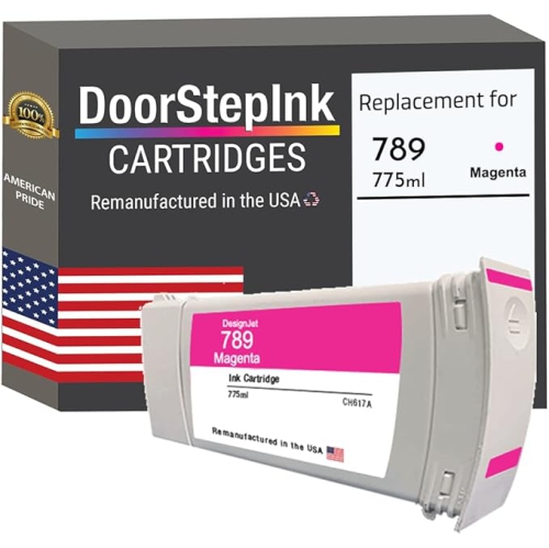 DoorStepInk remanufactured HP 789 775mL magenta ink cartridges are the highest quality wide format replacement ink cartridges on the market. Using only original HP CH617A magenta cartridges, we remanufacture each cartridge to the highest quality standards to match OEM ink level, color, and performance guaranteed!