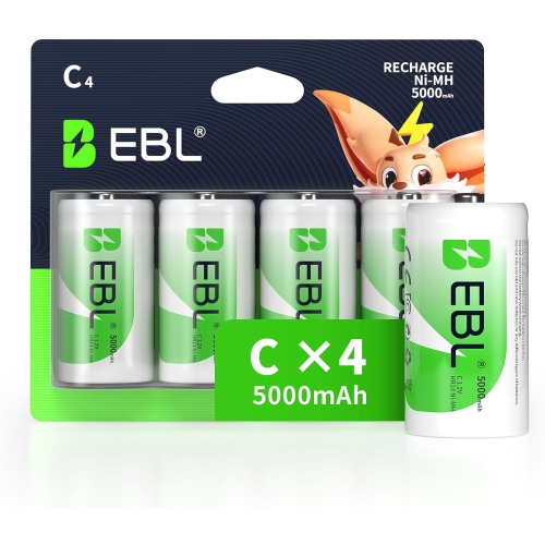EBL Rechargeable C Batteries, 5000mAh Ni-MH High Capacity C Cell Battery New Retail Package, Pack of 4