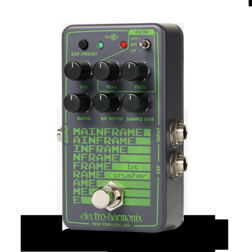 The Mainframe's selectable High/Low/Band-Pass filter lets the user shape the artifacts of the bit crushing and sample rate. Another very cool feature is its Sample Rate Tuning Mode where the pedal analyzes your input signal in real-time and sets the sample rate to match the pitch of your signal, or a set interval above your signal. This allows you to set the sample rate to match the key of a song, or it will continually adjust the sample rate based on what you play!"