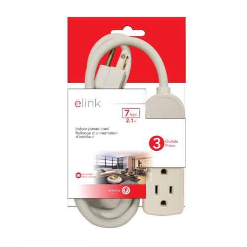 Elink EL-883 3 Outlet Grounded Interior Extension Power Bar 7Ft White