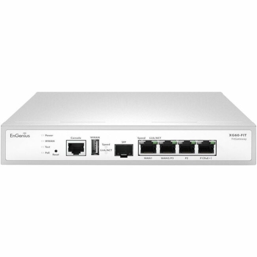 EnGenius FitXpress Gateway XG60-FIT - 4 Port - 10/100/1000Base-T, 1000Base-X - Gigabit Ethernet - 384 MB/s Firewall Throughput - DES, 3DES, AES (256-bit), MD5, SHA-1, SHA-2 512-bit - 50 VPN - 3 x RJ-45 - 1 Total Expansion Slots - Wall Mountable * Product Images are samples and may not match the product in exact detail.